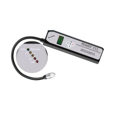 Handheld gas leak detector with suction pump for the selective detection of carbon dioxide (CO2). Patented photo-acoustic gas measurement method (Patent: DE 19957364 B4). Microprocessor controlled device. Display range from 100 ppm up to 100 Vol% CO2 (value, bar graph). Additional display of the thresholds from 0 Vol% up to 100 Vol% by LED. “Set” key for resetting the indicated concentration. Automatic zero setting and change of the measuring range. Acoustic signal depending on concentration (can be switched off). Separate charger for recharging of builtin rechargeable batteries.