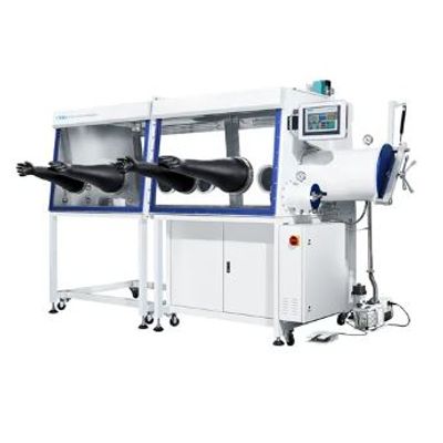 Dual workstation Glovebox systems, to be operated side by side with integrated Gas purification system (One Purifier-MK100), PLC controller and HMI, incl. sealed box, In and outward transfer antechamber, inclined operation sides with replaceable sight glass and vacuum pump etc. Attainable purity of the glovebox is H2O<1ppm, O2<1ppm