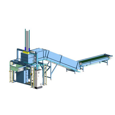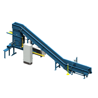 The V-SKR is a single box fiber press. This machine is typically used for applications with low to medium capacity. This press handles about 3 to 14 bales per hour. We use a loader for greater capacity. In most cases, the machine is fed by a conveyor in conjunction with air transportation. As an option, the machine can be fitted with automatic wrapping, strapping, and bale evacuation.