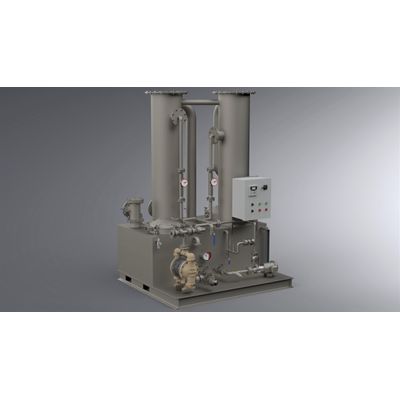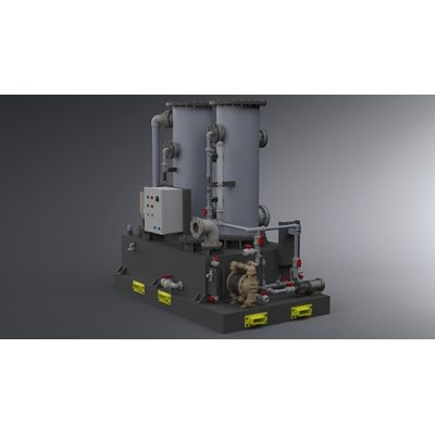 The PPT-24 vapor scrubber system is an all-poly unit designed for applications where steel is not suitable. This includes acids, chlorine and chlorinated vapors or chemicals. This unit is skid mounted and comes with an electric (main) and air-operated diaphragm (backup) pump. Good for vapor flows up to 1250 CFM. The PPT-24 has two towers with a total packing height of over 7`. The unit has a large solution reservoir (450 gallons) which reduces down-time to change spent chemical media. Options such as pH control and blowers are available. Available for purchase or rental.