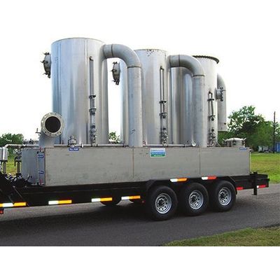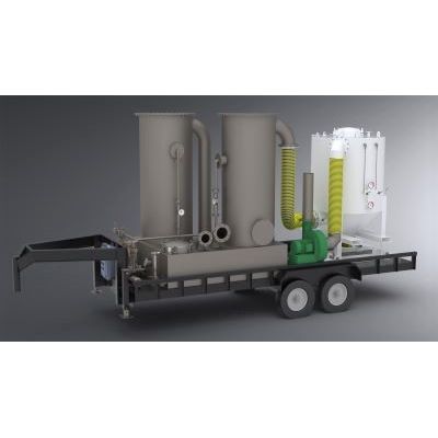 This system is made of stainless steel and mounted to a gooseneck trailer. Vapors are scrubbed through three, 54" diameter towers (8 foot tall each). Unit has on-board pump (460V) which provides flow to all three towers. Third tower has full diameter mist eliminator which removes mist particulate from exiting the scrubber. This scrubber is rated up to 6,000 CFM. Large 1800 gallon reservoir greatly enhances run times which means less down-time changing out solutions. As a separate item, a radial carbon adsorber (R4K Radial) is available to polish vapors up to 99.99%. This unit simply sits behind the scrubber system and may be connected to a blower to help evacuate tanks or process equipment.
