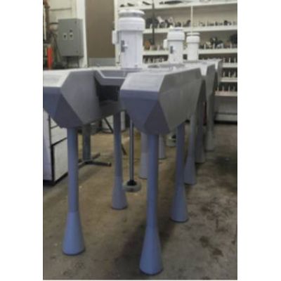 Legs are made of polyethylene. Each of the four legs inserts into a mounting cavity in the pontoons. Each leg is held in place by a Schedule 80, 2-inch threaded end cap. Legs are designed to prevent the rotating turbine from striking the bottom of the lagoon in low water conditions. The legs can accommodate air shaft lengths up to four feet. The legs have air holes at the top and the bottom to let air escape as they are lowered into the water.