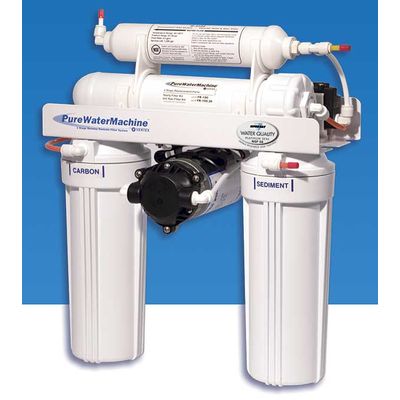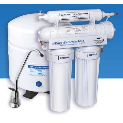 4-stage and 5-stage undersink Reverse Osmosis filter system with high volume 50 GPD membranes optimized to treat city water using the existing water pressure. IAPMO Certified, these sturdy and reliable US made systems have been in the field for over 15 and are proven to be reliable. VERTEX PureWaterMachines fit under most sinks and make clean, great tasting water at the point-of-use, eliminating the need for bottled water. An automatic shut-off valve conserves water by shutting the unit off when the storage tank is full.