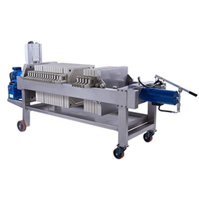 Filter press with leaning plates LFA 400×400. Standard version in stainless steel AISI 304 on wheels featuring: Fixed plate complete with inlet pipe with ball valve connected to the feeding pump installed on board and outlet pipe with sight glass and ball valve.