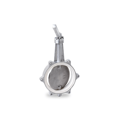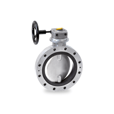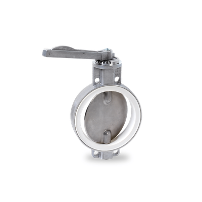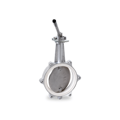 Butterfly Valve with ratched hand lever. Range of Nominal Widths: DN 50 - DN 600. Operating Temperature: - 40°C to + 200°C*. Differential Pressure: up to 10 bar*. Sleeve: replaceable or fix vulcanized.