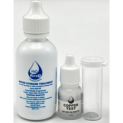 H2O ResQ is a Scientifically engineered solution that treats water with mineral ions. H2O ResQ defends against Bio-Film sticking to surface walls. It is a highly effective long-term solution for maintaining fresh tasting water. H2O ResQ is endorsed for treating and storing water by the former Commander of Public Health Service (retired). H2O ResQ stays in solution long-term and can be tested with our copper reagent- no need to rotate water every six months and lasts up to 5 years. Scientifically engineered, by the former Chairman of The Chemical Engineering Society. Developed to defend against biofilm adhesion on surfaces. Extends the life of filters by soaking overnight, in a solution of H2O ResQ as per instructions, can be used with any type of filter media- reduces calcium buildup. iron/rust buildup and bio-film adhesion.. Simple, and easy to use. 1 drop treats (1) liter of water. 10 mL (1/3 ounce treats 55 gallons). 2 ounces treats (330 gallons).