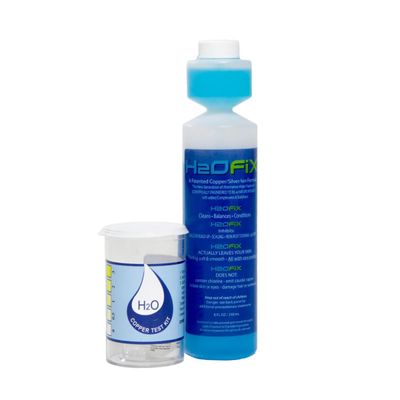 H2OFix, IS the most advanced and scientifically engineered, hot tub/spa water treatment product ever developed. Engineered by the former Chairman of the Chemical Engineering Society, Endorsed by the Commander of Public Health Services, (Retired), H2OFiX is the simple, easy to use, one-step solution that makes balancing easy, One 8 oz bottle of H2O Fix, typically lasts 6 to 8 months, sometimes longer, one ounce treats 400 gallons, The results are a crystal clear, clean, soft, odor free hot tub/spa, Reduces slimy buildup on surface walls, scaling or calcium buildup, H2O Fix works synergistically with chlorine and bromine. Reduces the need for additional chemicals by up to 90% , Comes with copper test reagent, good for approximately 40 tests.