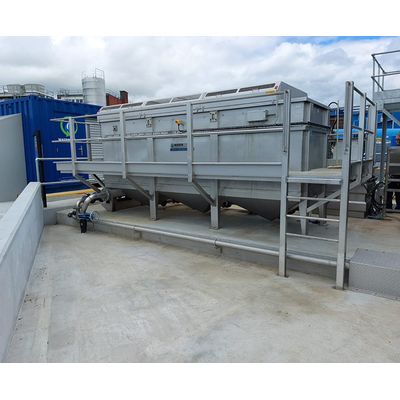 A no-moving part unit that cascades solid laden slurry down a wedge wire screen to separate solids from liquids. The slurry is pumped or gravity fed into the unit’s top chamber, flows over a full width weir and cascades down the curved screens surface. The liquid passes through the screens voids into a collection chamber below. Solid particles larger than the screens void size stay on the surface, and as this accumulating mass increases in weight/volume, gently slides down the screens surface, compacted and further dewatered as it travels down. At the bottom discharge chute, the solids simply drop off or in some applications, go for further dewatering by a drum or screw press unit. The static screen version has it screen rigidly fixed in position whereas the other, more efficient unit, has its screen mounted to enable a small motor to vibrate it. Static and vibrating options, each with 6 capacities up to 250 m3/hr.