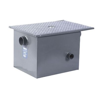 Series OI recessed or floor mounted epoxy coated steel oil interceptor with gasketed epoxy coated steel skid-proof cover secured with hex head center bolt(s), double wall deep seal trap, draw-off connection and dual vent connections, integral stainless steel flow control plate, and no hub (standard) connections.