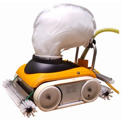 The Weda 2000 is a very powerful cleaner for cleaning operations in mid-size to large pools or for pools and aquatic parks with large numbers of swimmers. The W2000 is equipped with a safety transformer that brings safe 42 V to the cleaner. The strong suction of this cleaner allows for wall cleaning. The timer function enables the operator to delay the start of the cleaner so that the sediment in the pool has had time to settle on the bottom. The timer also allows for setting of the running time for the cleaner. The rotating brushes release the bottom sediment and moves it towards the suction inlet on the bottom plate of the cleaner. The powerful pump pumps the water through the collecting filter bags or through a discharge hose to the main filters of the pool or to waste.
