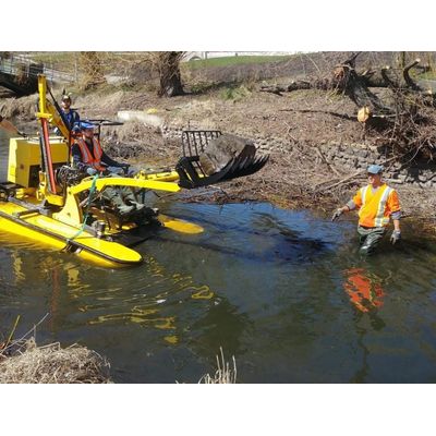 Fiberglass/Kevlar hull configuration includes deck mount marine boom cutter, front-end loader with universal marine bucket system and T-1305 highway transportation trailer. Factory installed PowerPack features diesel engine options with electric start. Cyclonic hydraulic system provides eco-friendly fluid to high efficiency triple pump setup producing 27 GPM. System includes twin propulsion outdrives with Weedoo Weed-N-Mud propellers and quick change hydraulics for aquatic work attachments.