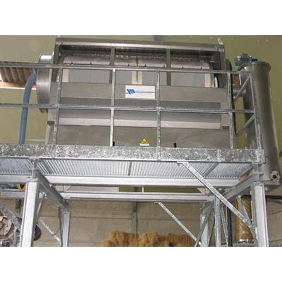 Compact and efficient gravity filtration. Thickening drums are similar to thickening tables focusing on the force of gravity to filter sludge. Contrary to the belt in a thickening table which is mounted horizontally on a table surface, the filter belt on thickening drums is mounted on a rotating drum. Due to their compact construction and their smaller filtration surface thickening drums are ideal for dewatering sludge flows to a capacity of 50 m³ / h. Just as thickening tables drums are often used in combination with a filter press or sieve belt press because they increase the separation efficiency at a very low cost, and without any supervision.
