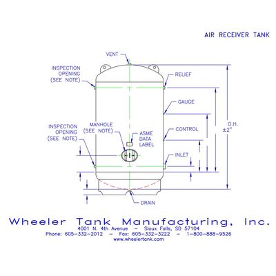We build air receiver tanks for commercial and industrial applications. We offer all our standard sizes in both a vertical and horizontal tank, and all sizes are also available with protective jacketing or UV protectant coating and insulation options: spray foam, foil back fiberglass, or armaflex. ASME stamped vessels 36″ diameter and smaller require 2-inspection openings. 42″ diameter and larger require a 12″ x 16″ manhole. Vessels with protective lining require manhole for access. O.A.L. dimensions are nominal +/- 2% shall be allowed (2″ minimum). Capacity is nominal +/- 2% shall be allowed. Tank dimensions are approximate and subject to change. Tank dimensions should not be used for pre-piping.
