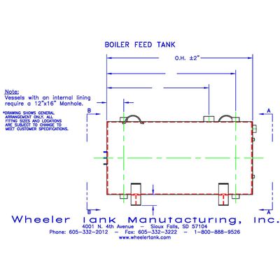 We build boiler feed tanks for commercial and industrial applications. We offer all our standard sizes in both a vertical and horizontal tank, and all sizes are also available with protective jacketing or UV protectant coating and insulation options: spray foam, foil back fiberglass, or armaflex. ASME stamped vessels 36″ diameter and smaller require 2-inspection openings. 42″ diameter and larger require a 12″ x 16″ manhole. Vessels with protective lining require manhole for access. O.A.L. dimensions are nominal +/- 2% shall be allowed (2″ minimum). Capacity is nominal +/- 2% shall be allowed. Tank dimensions are approximate and subject to change. Tank dimensions should not be used for pre-piping.