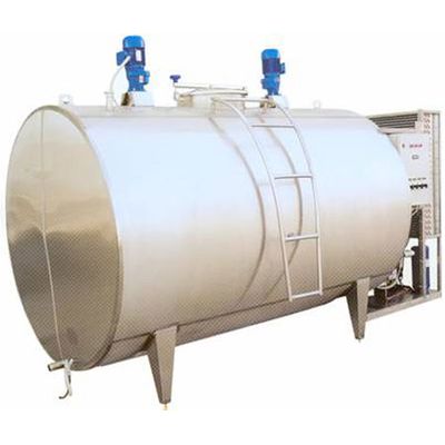 Standard sizes range from 500 though 7,000 gallon. Built entirely of Type 304 Stainless Steel. No 4 polished finish with largc-radius corners. Indicating thermometer. Mueller Temp Plate heat transfer surface for precise, consistent temperature control. Paddle type agitator for thorough movement of contents. Two inch, rigid insulation. An 18-inch top manway with cover and gasket. Air vent and product inlet. Two-inch, Mueller disc-type, outlet valve. Stainless steel ladder on sizes , 800 gallon and larger.