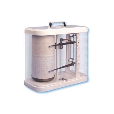 Thermohygrograph for recording ambient temperature. Temperature sensor is a high-grade bimetal that is recording temperatures on the drum through a pointer mechanism. The case is made of white coated aluminum die casting and removable upper part with crystal-clear Macrolon panoramic hood. All parts have been manufactures from corrosion-resistant materials.