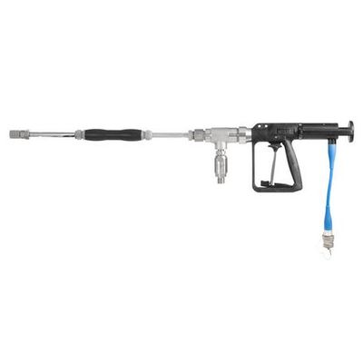 The HP 1500S-V-E-24V and high-pressure gun is suitable for spray work up to 1500 bar. The gun is fitted with a mechanical valve and an additional electrical switching contact. The high pressure operation of the appropriate device is switched on and off by an electrical switching contact.