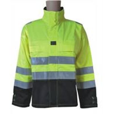Flame Retardant Anti-static Yellow/black Jacket. Fabric: Cotton 80% Polyester20% Satin Yarn Count:30/2*10. Flame Retardant . Anti-static 1cm*1cm Lattice Conductive Fiber. Fluorescent Yellow /black Color. Accessory: loxy Reflective Tape Ykk One-way Copper Zipper. Chest Card Plastic Sheet Copper Snap Button.