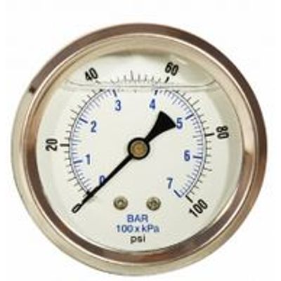 Zenport BLPG100 Zen-Tek 0-100 PSI Back Mounted Liquid Glycerin Pressure Gauge. 0-100 psi Glycerin `Liquid` Filled Pressure Gauge: 2.5" case diameter, 1/4 NPT, Back Connection, ABS case, 372 plastic window, brass internals and connection. Grade `A` Accuracy (1.6%)