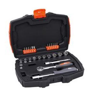 12pcs 25mm bits, CRV,size: SL 5.5,6.5 mm PH: 1, 2. PZ: 1, 2 Hex: 3 – 4 – 5 Torx: 10, 15, 20. 1pc 1/4"Spinner handle,CRV. 12pcs 1/4"sockets, CRV,size: 4, 4.5, 5, 5.5, 6, 7, 8, 9, 10, 11, 12, 13 MM. 1pc 1/4"extension bar, CRV,size:100 MM. 1pc 1/4"quick release ratchet handle, CRV. 1pc 1/4"Coupler, CRV. Packaging : blow mold case
