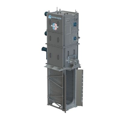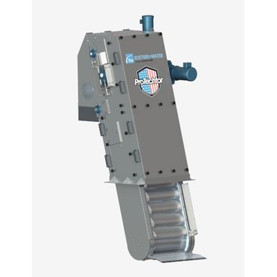 The Kusters Water ProTechtor® Centerflow Band Screen, with its vertical orientation, is an excellent alternative to applications with limited footprint and headspace. Influent flow enters the screen in the middle of the screen frame, and is positively screened as the flow transitions from the inside and passes through the traveling perforated filter belt through the sides and bottom. Optimally spaced lifting tines are attached to filter panels to capture and elevate larger items to the internal discharge point. Screenings are washed off via spray headers and/or a combined motorized brush assembly, and are discharged to an internal flume or screenings washer compactor, which transports the screenings outside of the screen frame. The quality of the screened effluent is drastically improved which in turn improves performance and better protects downstream equipment.