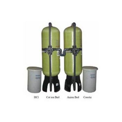 A demineralizer system consists of one or more ion exchange resin columns, which include a strong acid cation unit and a strong base anion unit. The cation resin exchanges hydrogen for the raw water cations and the anion resin exchanges hydroxyl ion for raw water anions. The equipment used for cation-anion demineralization is similar to that used in softening. The primary difference is that the vessels, valves, and piping must be made of (or lined with) corrosion-resistant materials. Rubber and polyvinyl chloride (PVC) are commonly used for ion exchange vessel linings. The controls and regenerant systems for demineralizers are more complex, to allow for such enhancements as stepwise acid and warm caustic regenerations.