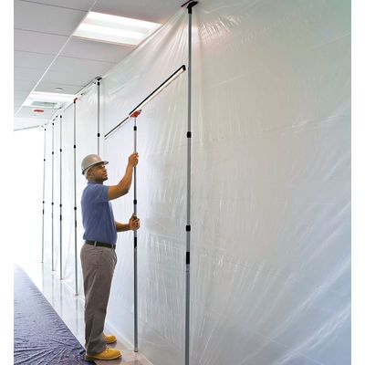 Ideal for professional contractors – both commercial and residential. Six spring-loaded poles secure a dust barrier up to 12 feet high and 50 feet wide. Strong and lightweight anodized aluminum construction. Innovative non-skid, non-marking head and plate. Package contains six poles with parts (heads, plates, and GripDisk™ non-slip pads). Quick & easy to set up — no ladders, no tape, no damage.