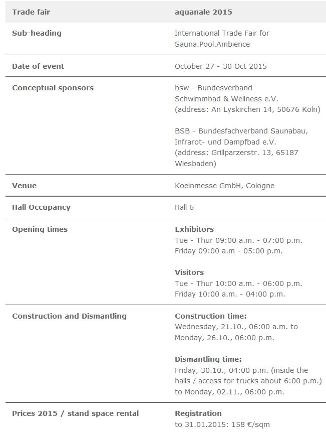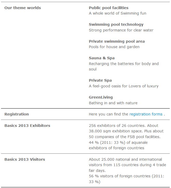 New momentum for the swimming pool and wellness industry in Cologne: The trade fair duo will take place from 27 – 30 October 2015 in Cologne with a completely new appearance, across an exhibition area of around 80,000 sqm in Halls 6, 7, 9 and 10.2. The desegregation successfull ymoved already in 2013 of the swimming pool areas from aquanale and FSB is also maintained in 2015 and is developed. From now on, Hall 6 will house private and public swimming pool equipment as well as the sauna, spa and wellness sectors and forms one of the largest market places for the swimming pool industry in the world.