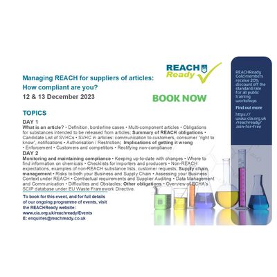 REACHReady is delighted to bring you this workshop which will outline the essentials of a compliance strategy that will help you identify if you are doing all you can to comply, recognise where business risks are likely to occur and how to minimise them and develop and maintain your strategy for compliance as part of good product stewardship. BOOK YOUR PLACE TODAY.