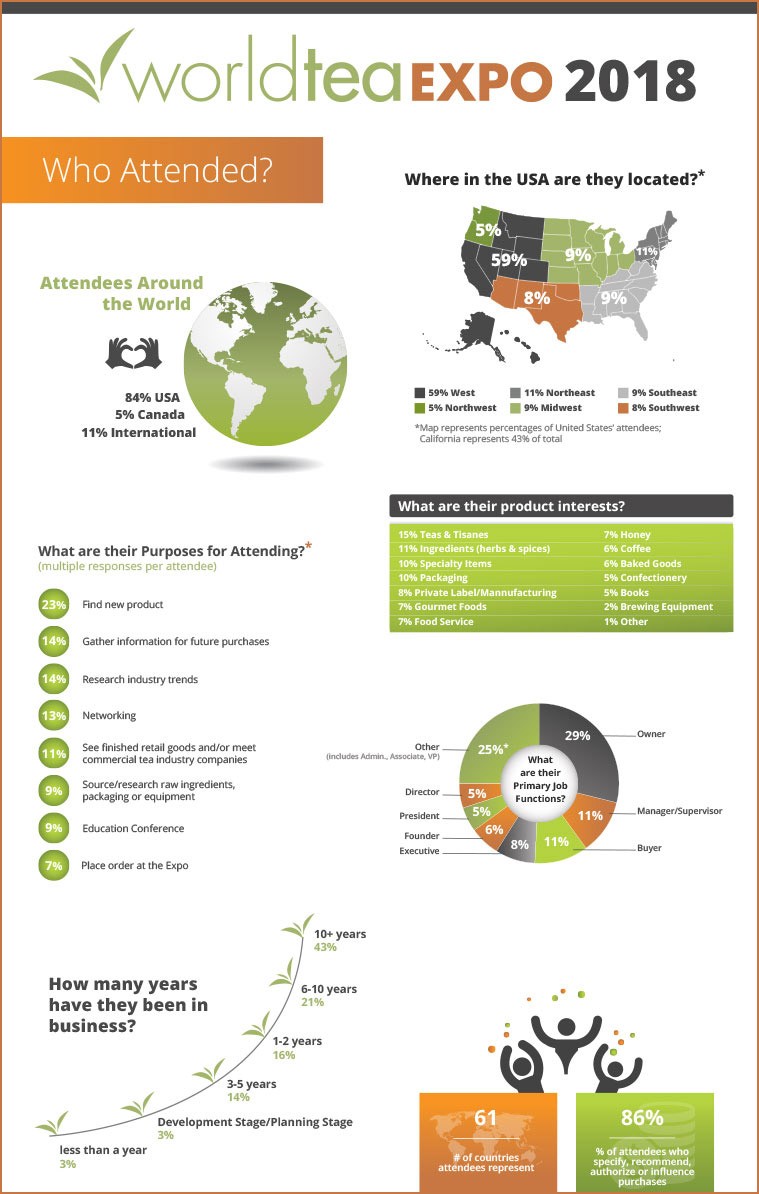 Retailers, tea room owners, distributors, F&B directors, spa managers, specialty grocers, mass merchants and other business professionals attend the Expo to see over 260 high-quality tea suppliers and related vendors from 22 countries exhibit new products and innovations. More than 30% of exhibiting companies exhibit no where else; attending World Tea Expo is an exclusive opportunity to visit these suppliers.