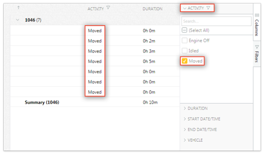 E.g., On a Daily activity report, you have three activity types under the "Activity" column viz., Engine Off, Idled and Moved. You may opt to show/hide any of these types as you would like to see on a report.