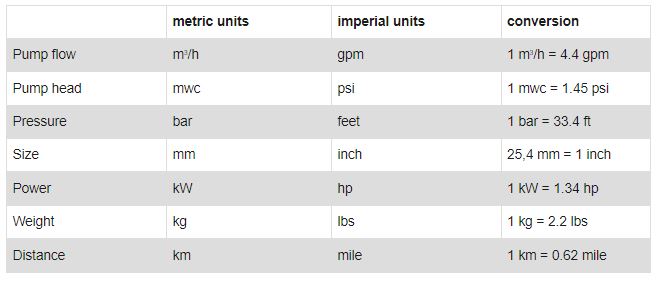 In the US, and partly in the UK, the imperial measurement system is used. In other parts of the world the metric system is standard. The table below provides an overview of the differences we encounter in the pump industry.