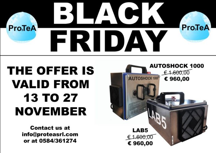 On the occasion of BLACK FRIDAY 2020 Protea launches a promotion for its most famous portable ozonizing systems: LAB5 and AUTOSHOCK 1000.