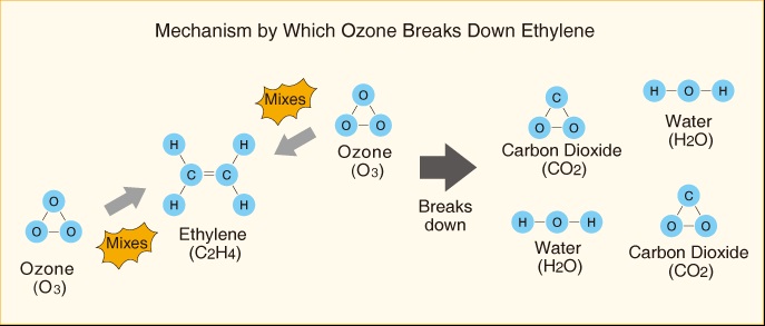 Well, even in this case the action of Ozone is oxidation: through a vigorous oxidizing action, ethylene is converted into carbon dioxide and water when the environment is humid and cold.
