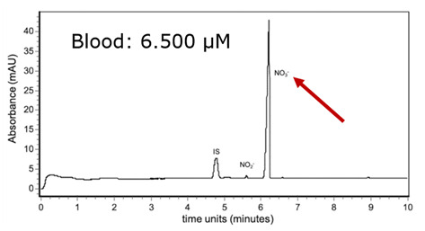 In the last decade, the number of reports on nitrite intoxication, both intentional and unintentional, has increased, raising demand for a fast, simple, and accurate method for the direct determination of nitrite and nitrate in blood and urine. However, this analysis is challenging since nitrite in blood is rapidly oxidized into nitrate. The research group of Prof. Franco Tagliaro in this laboratory recently developed an analytical approach which was successfully applied to Lumex Instruments’ Capel-205 CE system. The method was validated and used for the direct determination of nitrite/nitrate in biological fluids, including postmortem blood. Below is a typical example of the electropherogram, representing postmortem blood analysis after a fatal intoxication by nitrite.