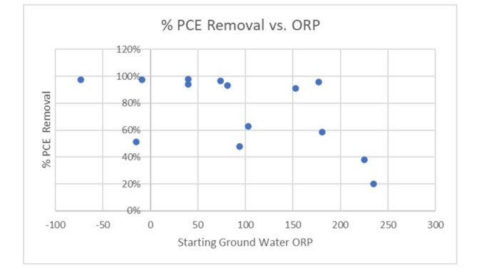 This compilation of data from different sites shows that with a starting ORP above -50, CL-Out bioremediation will be effective in PCE rempoval without the production of vinyl chloride. These results should be significant in selecting a remediation option for the prevention of vinyl chloride vapor intrusion risk by source removal.