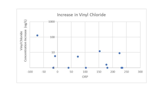 The following chart shows the vinyl chloride concentrations at the same 14 sites. As the PCE is degraded the vinyl chloride concentrations increased. The increase in vinyl chloride was 10 ug/L or less at most locations. A high increase in vinyl chloride was at a location where the ORP was less than -50. There does appear to be a threshold relationship between a low ORP less than -50 and a significant increase in vinyl chloride.