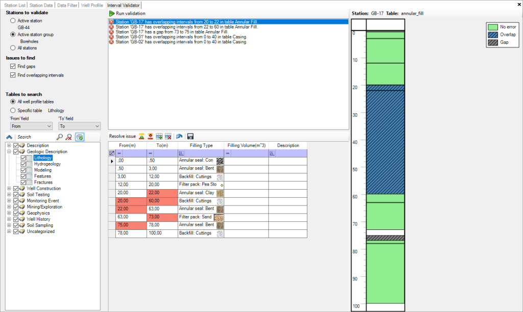 - Automated Validation: automatically check intervals of geologic, well construction or other interval data for a selected station or station group for inconsistencies: