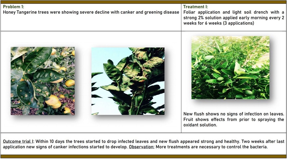 In 2015 to now, Jenfitch, Inc. (Walnut Creek, CA) has been working with GreenAgri Solutions, LLC (Springhill, FL) to develop a treatment for “citrus greening” that was recently registered with EPA (2020) and USDA Organic certified (2021). GreenAgri Solutions, LLC started testing in central Florida by treating one tree with a new oxidant developed from a mineral oxychloride formulation. They sprayed the leaves and watered the roots with a mineral oxychloride solution that generated an oxidized water having an ORP (oxidation-reduction potential) greater than +700 mV. They removed all the infected leaves. After a week, they started seeing a new “flush” on the infected tree. Then they expanded the test site to 20 trees. After 60 days of irrigating and spraying the trees with a +700 mV solution of the mineral oxychloride solution, all the trees in the test started to develop marketable fruit. The trial is now in its fourth year and has been expanded to two acres (one acre is the control site and the second acre is the treated site). Below is the initial study data: