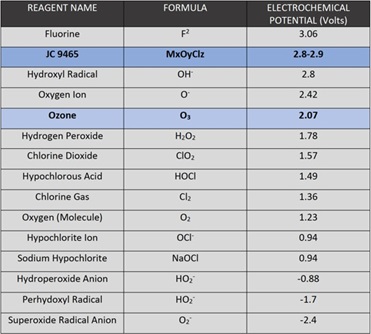 bacteria and viruses. Mineral oxychloride chemistry generates oxidative energy that is related to “reactive oxygen species – ROS” and it can be measured in millivolts using an ORP meter. Mineral oxychloride generates a high concentration of hydroxyl radical ions and other oxygen species that kill microorganisms in less than 10 seconds. In a study conducted at UC Davis-Post Harvest Dept, they concurred that raising the ORP to +700 mV inactivated E. coli, Salmonella, and Listeria in less than 10 seconds. In the Chart No. 1, we compare the electrochemical potential of each oxidizer.