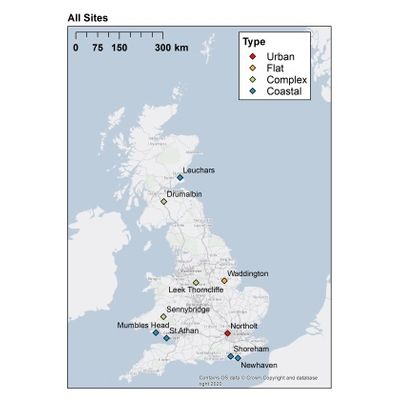 The report begins with an evaluation of NWP outputs in comparison with meteorological observations at eight UK sites (shown on the map). This is followed by a comparison of ADMS and AERMOD dispersion outcomes for idealised sources at four locations with observed and modelled meteorological data. The report also includes an investigation of the interaction between fine-scale NWP data and local flowfield modelling using the FLOWSTAR model for flow over complex terrain in ADMS. Finally, there are results from the UK Health Security Agency (UKHSA) investigation of the effects of NWP grid resolution on the outcomes of probabilistic accident consequence modelling with the PACE model.