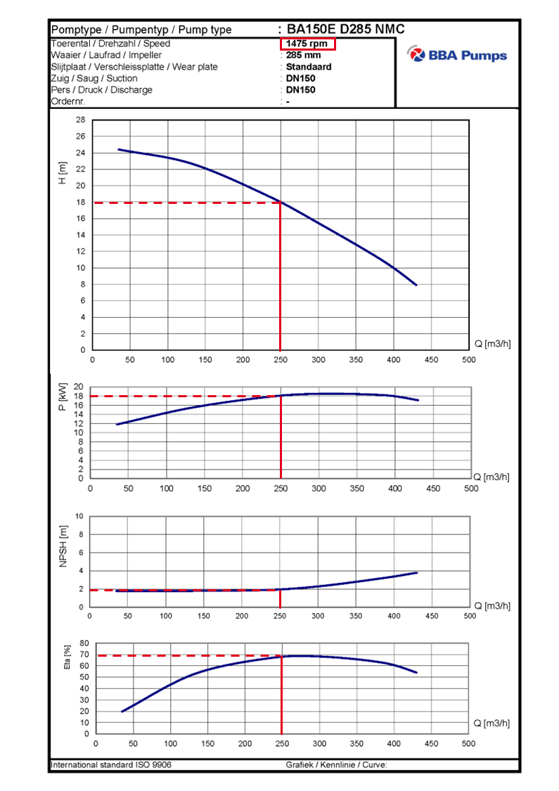 1. Pump curve: In the top chart you can see the pump flow along the horizontal axis. The pump head is shown on the vertical axis. For example, at 250 m³/h we draw a line upwards to the curve. From that point we draw the line to the left and we know the pressure that the pump delivers at that capacity, which is 18 mwc. This way you can easily determine the duty point at which the pump runs.