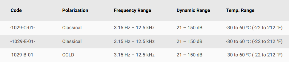 Type 1029 diffuse-field microphone is designed for random-incidence measuremnts over 3.15 Hz to 12.5 kHz. TEDS functionality is available. Type 1029 Series are 1/2`` diffuse-field prepolerized microphone sets optimized for general random-incidence measurements. Engineered for precision in complex acoustic environments, these microphones offer a wide frequency response from 3.15 Hz to 12.5 kHz and a dynamic range of 20 to 162 dB, making them ideal for both low-level ambient noise and high-intensity sound pressure levels.