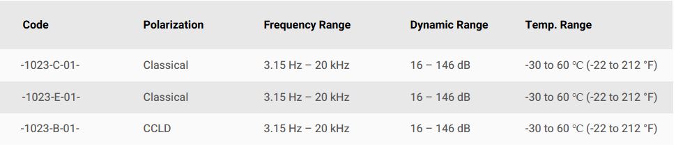 Type 1023 Series is our most recommended microphone set. know for its high sensitivity of 50 mV/Pa, and a dynamic range from 20 - 162 dB. To meet varying application needs, the standard Type 1023 Series offers a frequency range of up to 20 kHz, with extended versions available up to 40 kHz upon request.