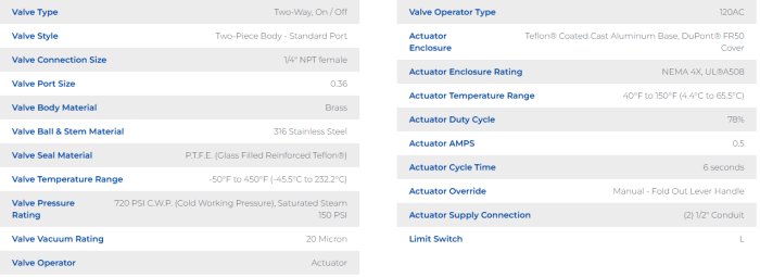 General Industrial Series two piece standard port brass bar stock body with 316 stainless steel ball and stem ball valve. Seats and Stem Seal are glass reinforced P.T.F.E. (Teflon®). Pipe connections are NPT (National Pipe Taper) female screwed end. Temperature Range -50°F to 450°F (-45.5°C to (232.2°C). Valve Body Pressure Rating 720 psi C.W.P. (Cold Working Pressure), Maximum Pressure Differential 400 psi – also see Differential Pressure Temperature Chart), Saturated Steam 150 PSI and a vacuum rating of 20 Microns. Self-compensating stem seal design. WARNING: Attention California Product Users: Brass raw materials used to produce this valve contains a small percentage of lead. Cancer or Reproductive Harm. See California Proposition 65 for details at www.P65Warnings.ca.gov Also see Product Specifications which can be found at www.geminivalve.com Products are marketed per Gemini Valve Standard Terms & Conditions. All Gemini Valve Products MADE IN USA.