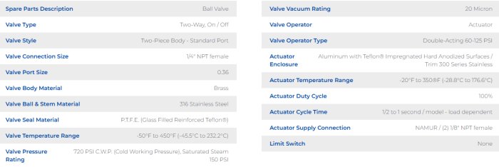 Valve is operated by Double-Acting (Air to Open / Air to Close) Pneumatic Actuator which operates on 60-125 psi air supply with an cycle (index) time of 1/2 to 1 second depending on model and load. Temperature Rating -20°F to 350°F (-28.8°C to 176.6°C). Air connection is NAMUR / (2) 1/8” NPT female ports to enable direct NAMUR or remote solenoid valve piloting. Actuator body aluminum with Teflon® impregnated hard anodized surfaces. Hardware 300 Series Stainless Steel. Permanently lubricated – maintenance free. Visual Open / Close indicator.