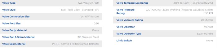 General Industrial Series two piece standard port brass bar stock body with 316 stainless steel ball and stem ball valve. Seats and Stem Seal are glass reinforced P.T.F.E. (Teflon®). Pipe connections are NPT (National Pipe Taper) female screwed end. Temperature Range -50°F to 450°F (-45.5°C to (232.2°C). Valve Body Pressure Rating 720 psi C.W.P. (Cold Working Pressure), Maximum Pressure Differential 400 psi – also see Differential Pressure Temperature Chart), Saturated Steam 150 PSI and a vacuum rating of 20 Microns. Self-compensating stem seal design. WARNING: Attention California Product Users: Brass raw materials used to produce this valve contains a small percentage of lead. Cancer or Reproductive Harm. See California Proposition 65 for details at www.P65Warnings.ca.gov Also see Product Specifications which can be found at www.geminivalve.com Products are marketed per Gemini Valve Standard Terms & Conditions. All Gemini Valve Products MADE IN USA.