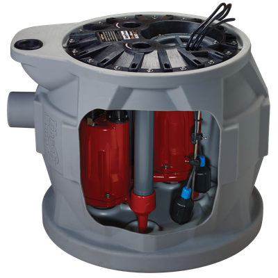 Compact duplex system - designed for sewage applications. Perfect for basement bathroom additions and remodeling projects. .75 kW. 2" NPT (~51 mm) Dischargea