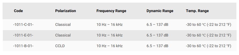 Type 1011 is designed for low-level, free-field measurements. The 1011 Series has low noise floors of 6.5 dB, and is compatible with CCLD and classical preamplifiers.