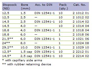 Stopcocks, straight bore, with solid glass plug. Acc. to DIN 12541-1 and in addition to DIN standard, with solid glass plug and screwthread retaining device, one straight bore, material: borosilicate glass 3.3, leakage rate acc. to DIN 12540-1.